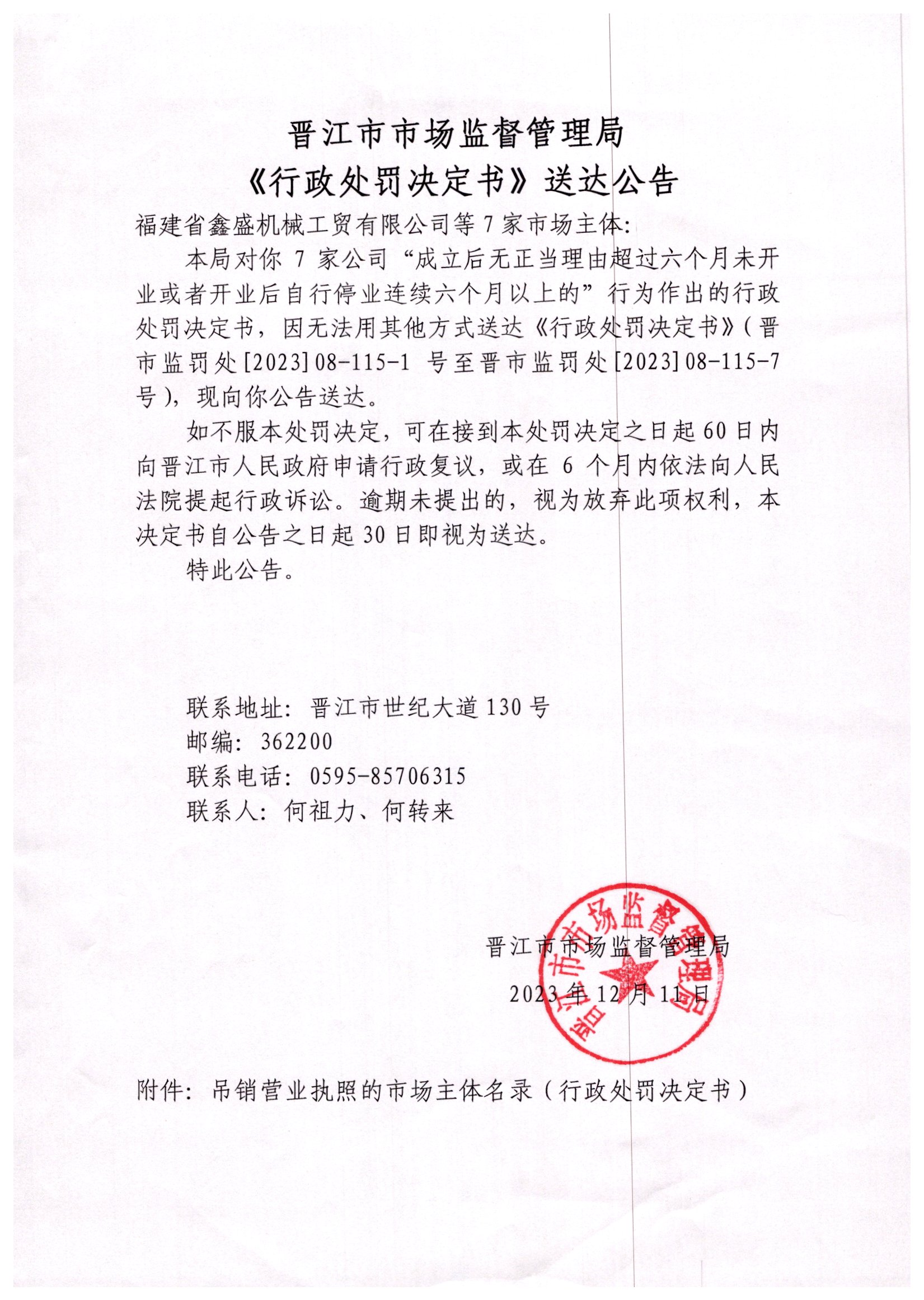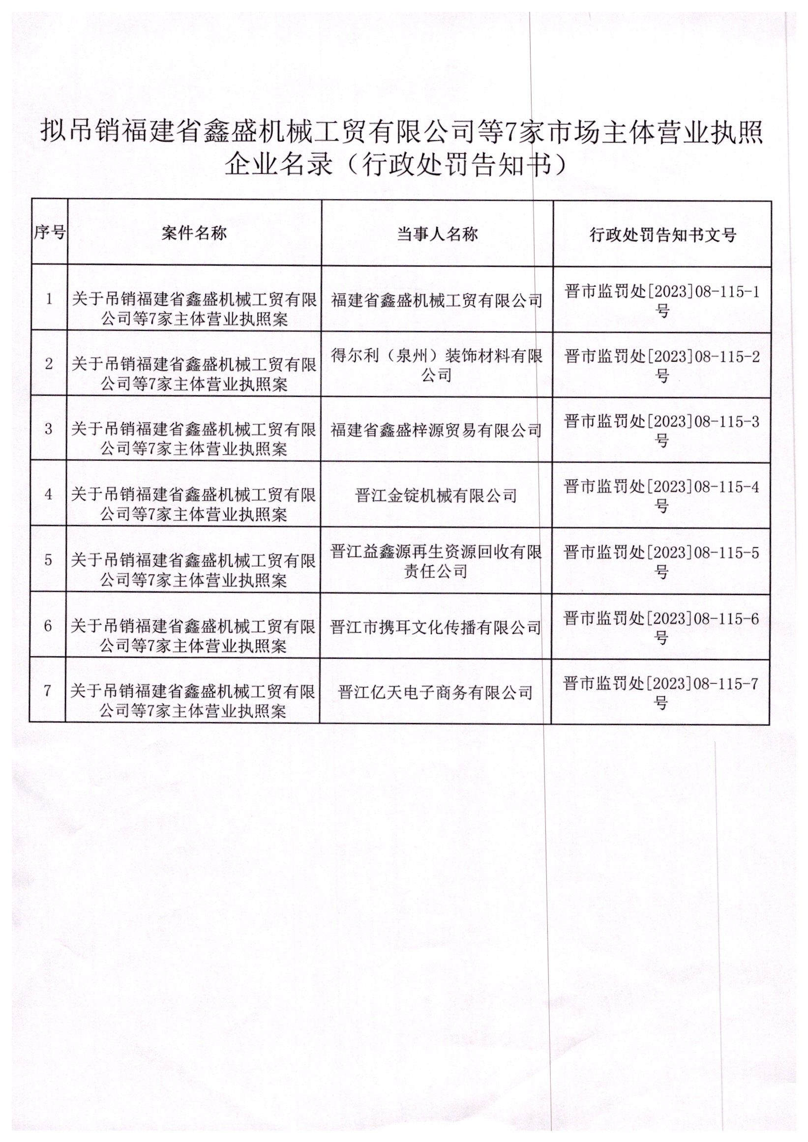晋江市市场监督管理局关于吊销福建省鑫盛机械工贸有限公司等7家主体营业执照的行政处罚决定书送达公告