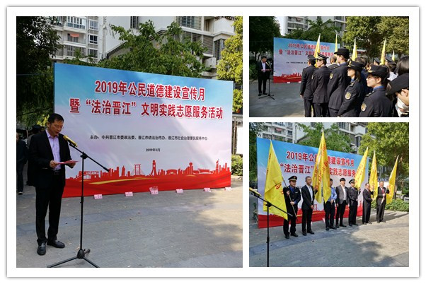 活动以“法治晋江”文明实践志愿服务团各分队授旗仪式为开场,市委常委、政法委书记陈长义为分队授旗,市委政法委副书记林劲松作强调讲话,他指出,法治和德治在维护社会和谐稳定、加快经济发展、促进政治文明建设等各个层面起着不可替代的作用,法治是德治的基础和保障,必须全面推进法治进程,紧抓普法这一关键环节。仪式的现场庄严肃穆,与会人员聚精会神,耳听心受。授旗一结束,各分队各自排开,全力宣传。
