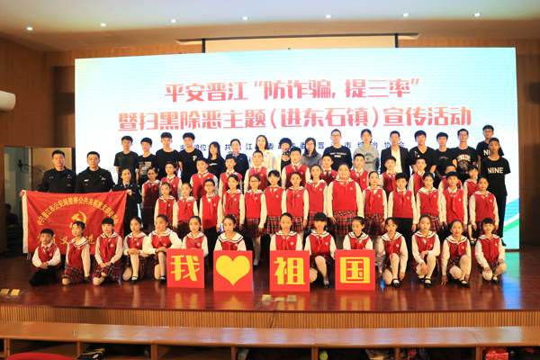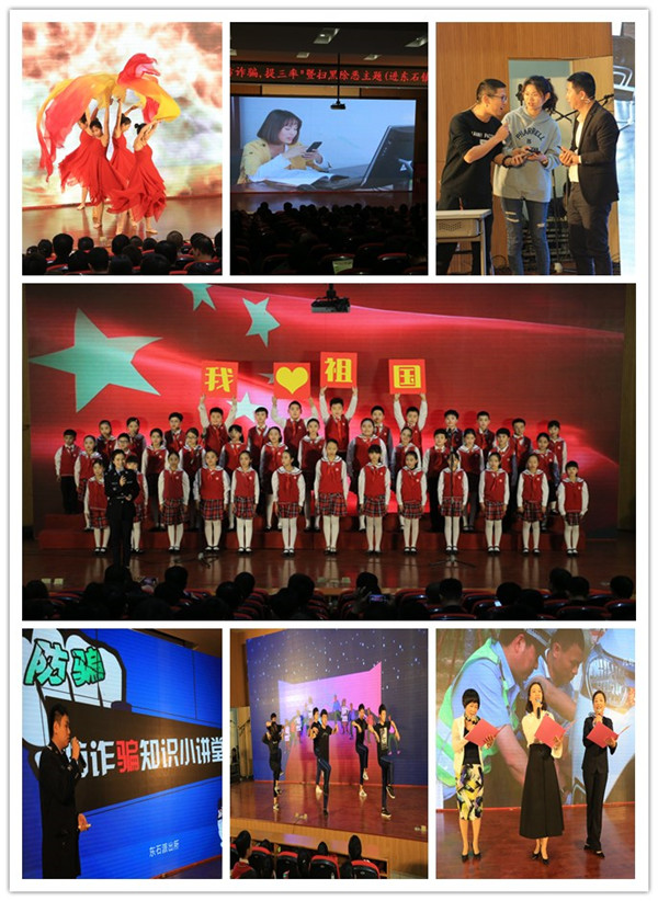 活动在开场舞《火红的时代火红的歌》中拉开序幕;东石所民警通过PPT演示,介绍了常见的诈骗手段、防范技巧和应对方法;东石镇3名老师通过深情朗诵推介“综治三率、六守六无”常识,为平安晋江点赞;企业员工自编自演防诈骗情景剧《网恋》,揭示了新型网络诈骗犯罪手段,普及了防骗小技巧;侨声中学街舞社同学们精彩的街舞表演令人热血澎湃;现场人员还通过观看微视频加深对防骗、扫黑除恶知识印象。活动中,穿插“微信摇一摇”问答方式进行互动交流,普及了防诈骗、综治“三率”、扫黑除恶、关爱流动人口等知识,诈骗犯罪侦查大队民警针对问题逐一进行讲解、提示防骗技巧。来自东石第二中心小学的40名小学生用一曲耳熟能详的《我和我的祖国》向祖国致敬,拨动了现场观众的心弦,将活动推向了高潮。此次活动还结合关心关爱、服务流动人口进行宣传,让流动人口感受到第二故乡的温暖。