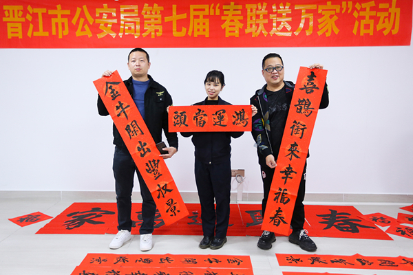 今天,立足“文化惠民”、“背包住村”工作,再次邀请书法家深入基层挥毫泼墨、赠送春联,既营造喜庆祥和的节日氛围,增进群众对中华年俗的了解,也提醒辖区群众注意安全防范、平安过年。希望各新闻记者、监督员在参与活动的同时,把平安祝福传播出去;希望在场社区干部、巡逻队员拿到春联后,把平安知识带给居民、亲朋好友;希望警民携手,全力配合做好常态化疫情防控,扎实推进平安晋江建设、“百日千警进万家”防骗集中宣传等工作,让广大市民更有安全感、获得感和幸福感。