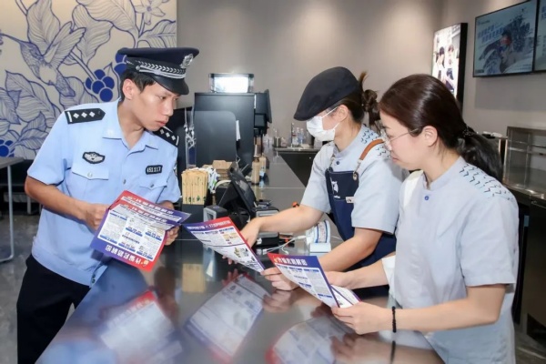 “警官您看,‘反诈平安饮’杯贴都是统一配发的,客人喝饮品时一眼就能瞅见提醒。” 一位咖啡店老板指着杯身的反诈标语笑盈盈地说。作为 “反诈联盟” 的重要一环,商户们不仅是经营者,更成了流动的反诈宣传员 —— 在加入联盟后,统一配备的反诈宣传标识置于摊位前,既让群众随时能找到求助渠道,也让防骗提醒渗透到点单、用餐的每个环节。