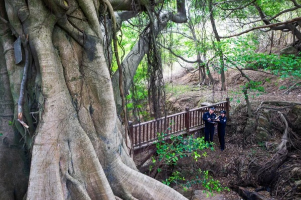 晋江市公安局创新巡护模式,整合民警、生态义警、村干部、护林员等多方力量,组建常态化联动巡护队,推行“地面徒步巡查+无人机空中巡航”立体化巡防模式,对偏远林区、零散村落的古树名木开展全方位排查。近三年,全市累计开展古树名木巡护2000余次,排查整改涉古树安全隐患60余处,实现古树名木巡护全覆盖、监管无死角。