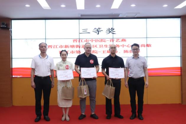 晋江市中医院院长刘其聪、中医药学会会长蔡文墨为“三等奖”获得者颁奖