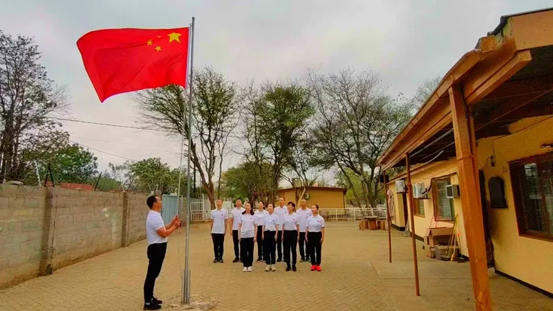 援非医疗队员在异国他乡升国旗,表达对祖国和亲人的思念之情。