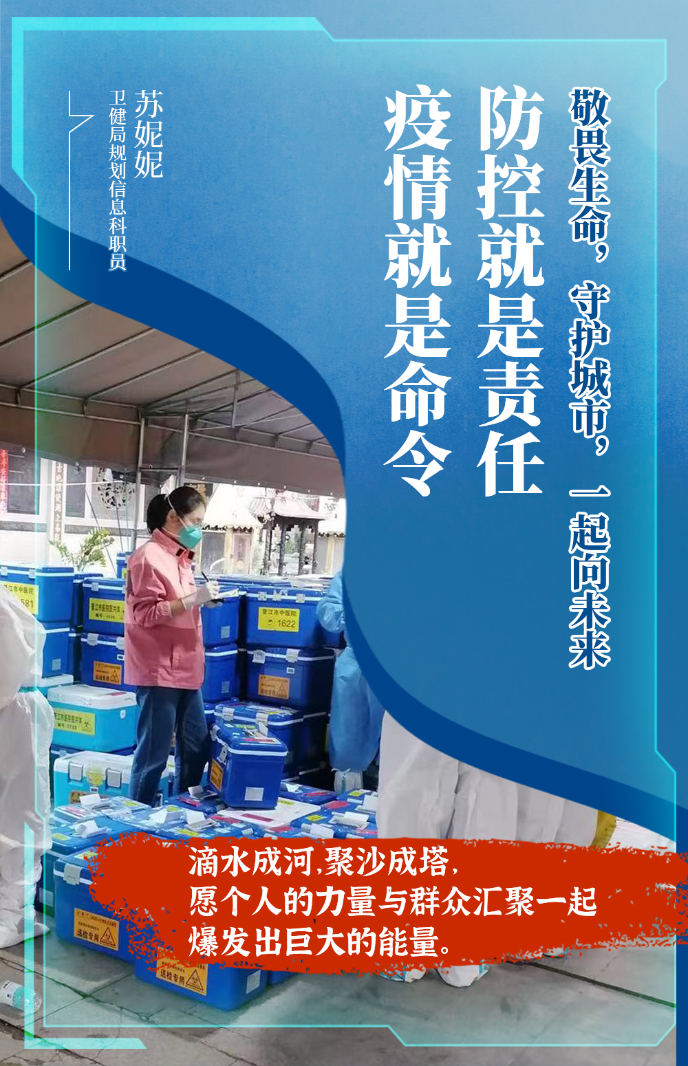 “白茹副局长和伟坛主任在帮忙统筹安排好人员调度、物资保障等工作后,又赶往陈埭镇抗疫一线。我和另外几位同事留在了池店镇。我们的工作比较琐碎,就是保障医护人员的物资、清点采集的样本、联系转运的车辆等等,基本上每天都要忙到凌晨。”苏妮妮说,经历了“3.13”、“8.18”两轮疫情,在这次工作中,大家都比较有经验,核酸检测效率大大提高了!