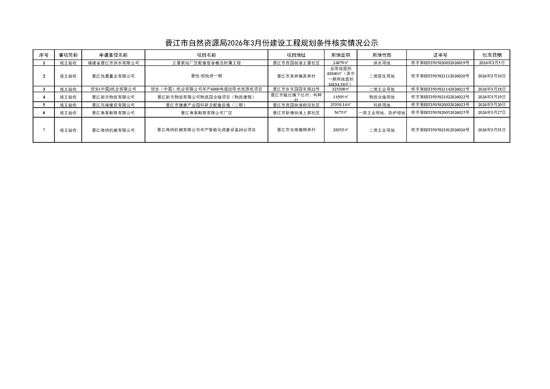 晋江市自然资源局2026年3月份建设工程规划条件核实情况公示