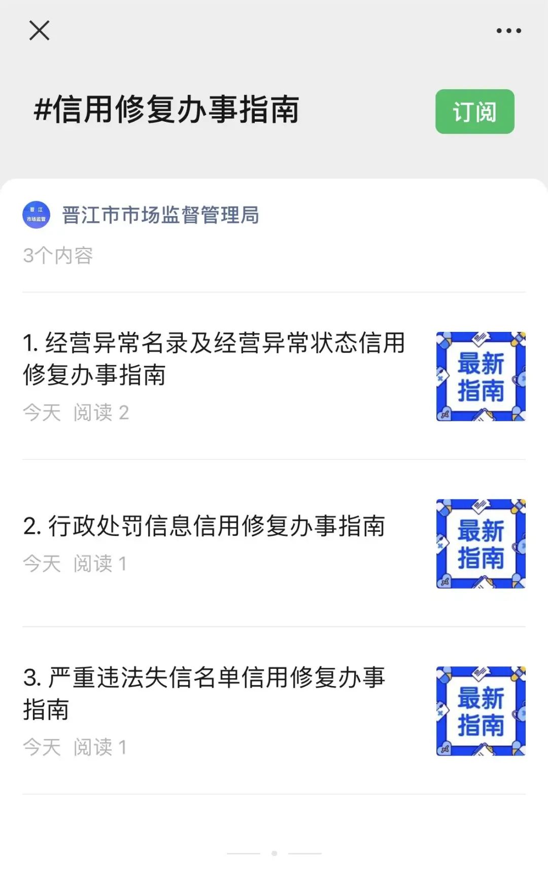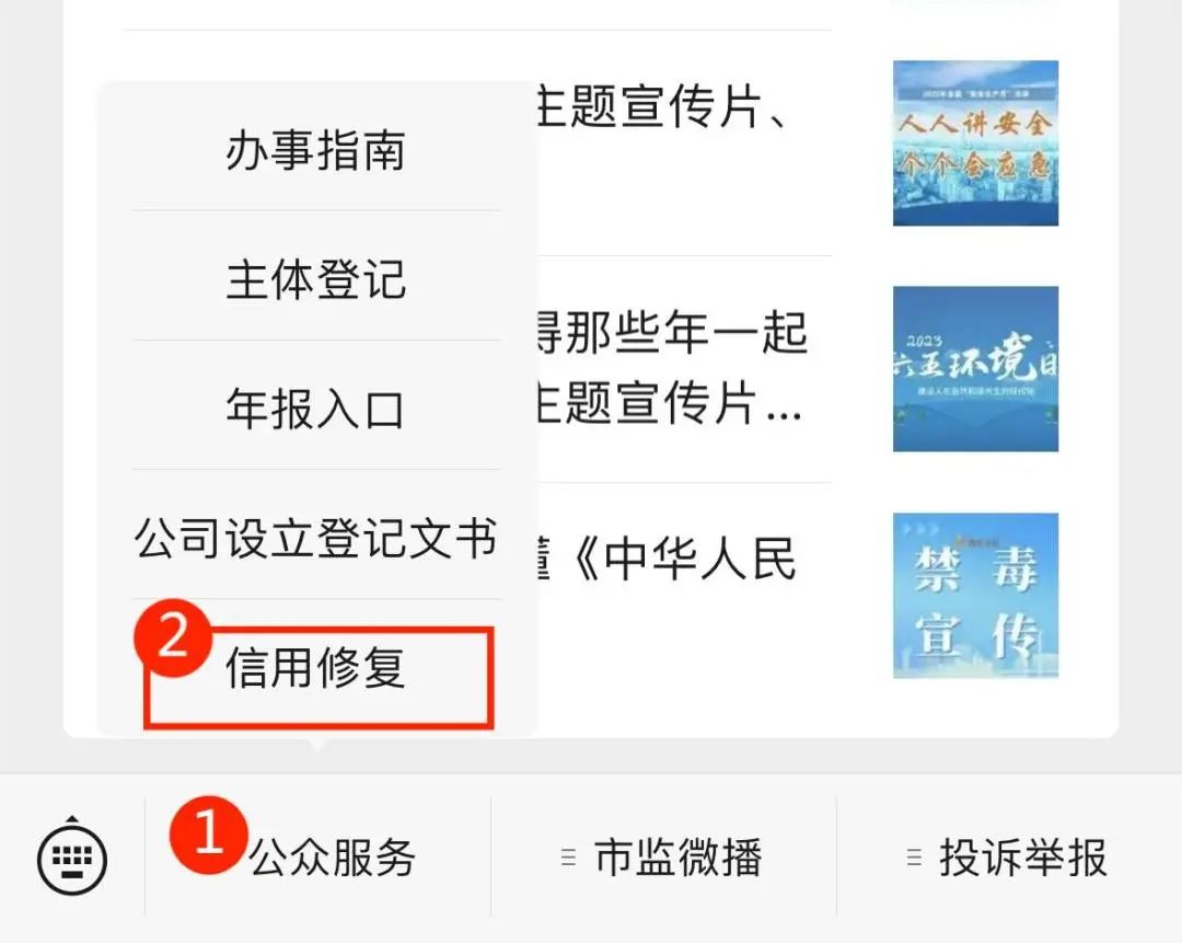 关注“晋江市市场监督管理局”微信公众号,点击左下方菜单栏【公众服务】—【信用修复】查看信用修复办事指南及相关文书下载