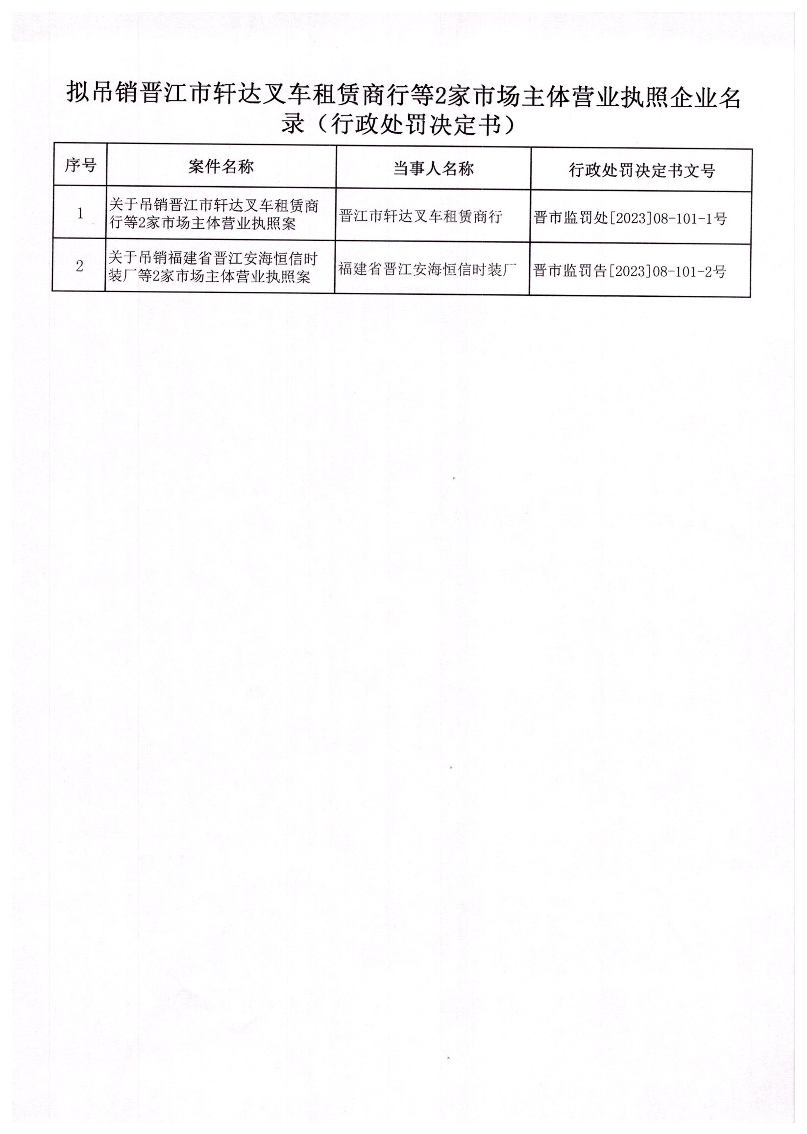 晋江市市场监督管理局行政处罚决定书送达公告(晋江市轩达叉车租赁商行等2家市场主体)